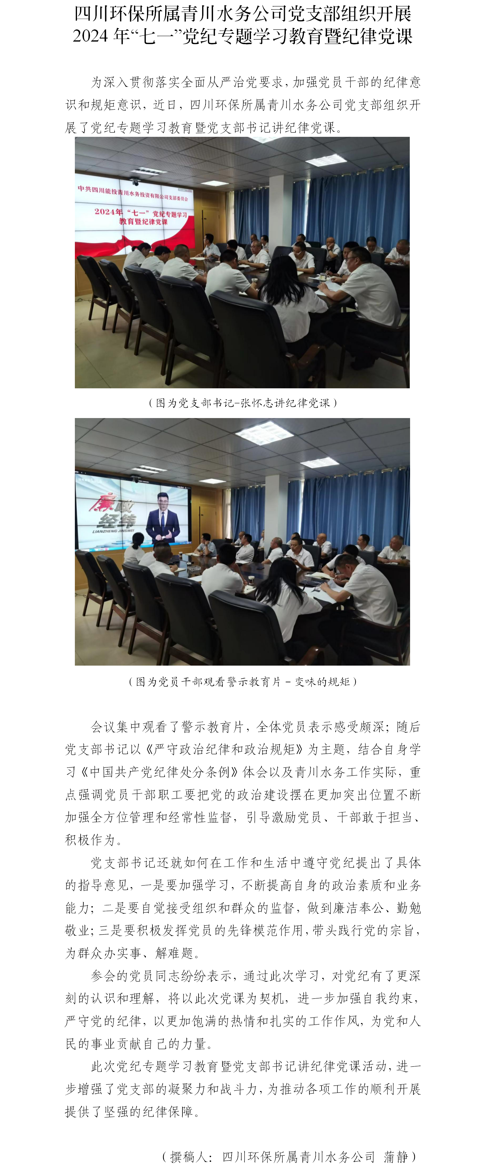 四川環(huán)保所屬青川水務(wù)公司黨支部組織開展 2024年“七一”黨紀(jì)專題學(xué)習(xí)教育暨紀(jì)律黨課